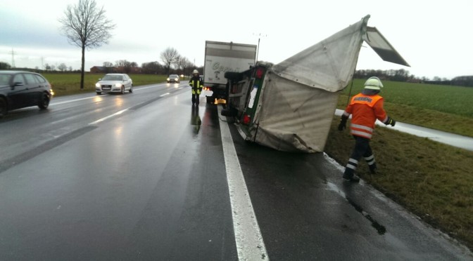 Am Samstag Nachmittag gegen 15.15 Uhr kam es auf der B4 zu einem Verkehrsunfall. Ein aus Uelzen in Richtung Lüneburg fahrender LKW mit Anhänger, wurde von einer Orkanböhe erwischt und der Anhänger kippte auf die Seite.