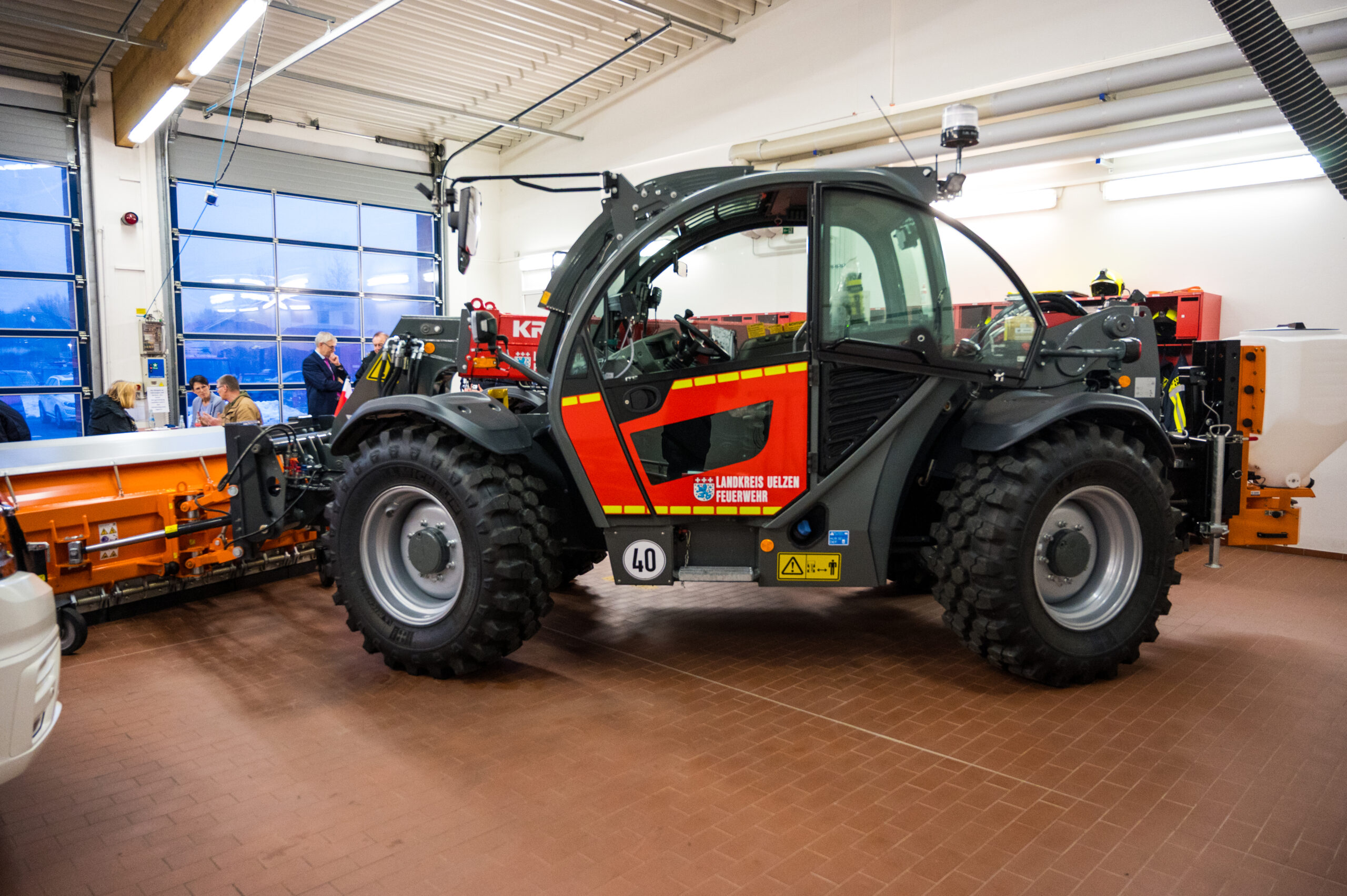 Mit dem neuen Teleskoplader der Firma Kramer verfügt die Kreisfeuerwehr zudem über ein vielseitiges Arbeitsgerät. Durch den Einsatz verschiedener Anbaugeräte – etwa Schaufel, Palettengabel, Schneeräumschild inkl. Salzstreuer, Containerhaken und Arbeitskorb lässt er sich flexibel an unterschiedliche Einsatzszenarien anpassen. Der Teleskoplader entlastet die Kräfte insbesondere bei schweren Arbeiten und wird auch in der Feuerwehrtechnischen Zentrale (FTZ) im täglichen Betrieb wertvolle Unterstützung leisten.