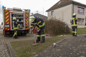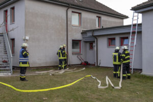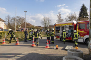 Eine weitere Lage stellte einen Brandeinsatz dar. Hier galt es, einen dreiteiligen Löschangriff aufzubauen. Dazu gehörte die Wasserentnahme, der Aufbau der Wasserversorgung sowie das Vorgehen eines Angriffstrupps zur Brandbekämpfung. Zusätzlich musste eine Steckleiter in Stellung gebracht werden, um einen Zugang zu einem höher gelegenen Bereich zu ermöglichen und eine mögliche Menschenrettung vorzubereiten. Bei dieser Übung kam es vor allem auf ein strukturiertes Vorgehen, die richtige Aufgabenverteilung innerhalb der Gruppe sowie auf sichere Handgriffe im Umgang mit Geräten und Leitern an.