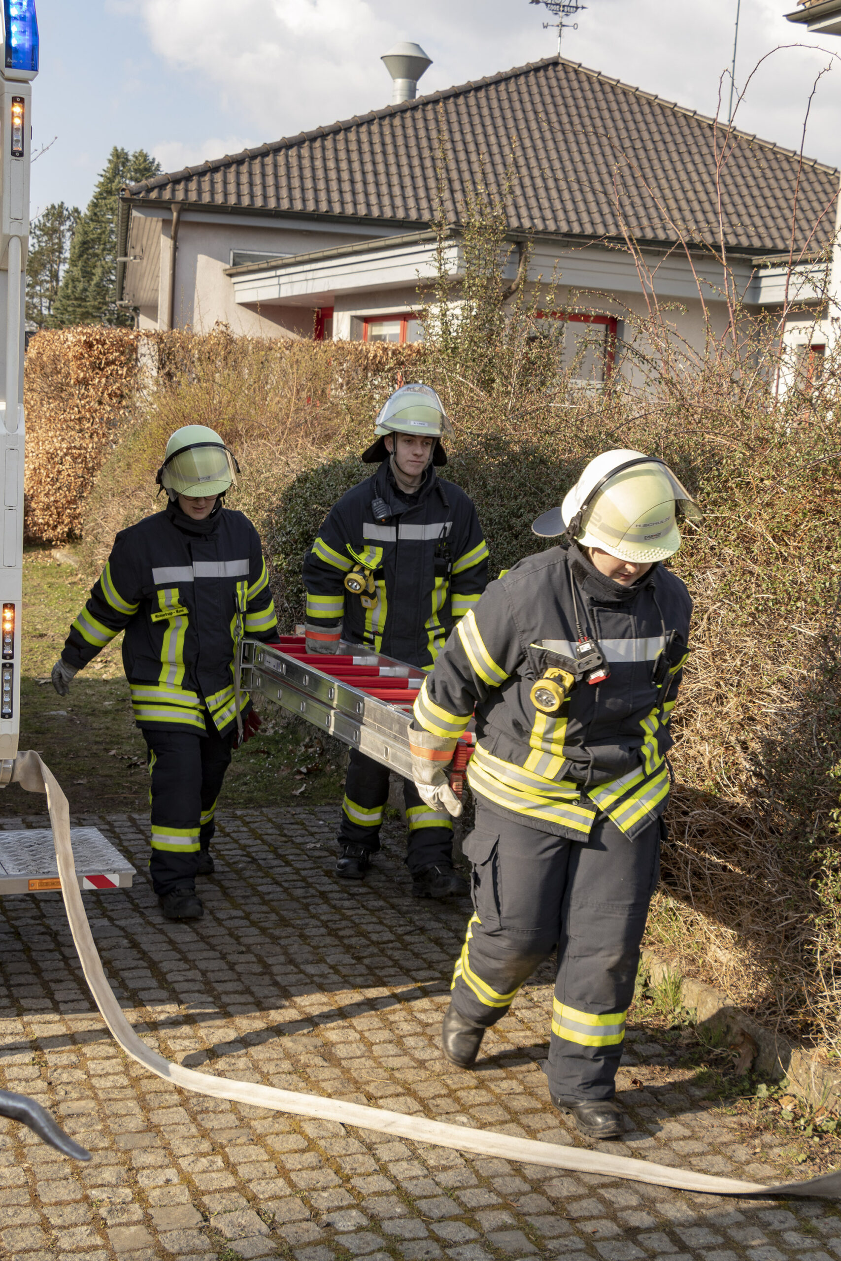 Eine weitere Lage stellte einen Brandeinsatz dar. Hier galt es, einen dreiteiligen Löschangriff aufzubauen. Dazu gehörte die Wasserentnahme, der Aufbau der Wasserversorgung sowie das Vorgehen eines Angriffstrupps zur Brandbekämpfung. Zusätzlich musste eine Steckleiter in Stellung gebracht werden, um einen Zugang zu einem höher gelegenen Bereich zu ermöglichen und eine mögliche Menschenrettung vorzubereiten. Bei dieser Übung kam es vor allem auf ein strukturiertes Vorgehen, die richtige Aufgabenverteilung innerhalb der Gruppe sowie auf sichere Handgriffe im Umgang mit Geräten und Leitern an.